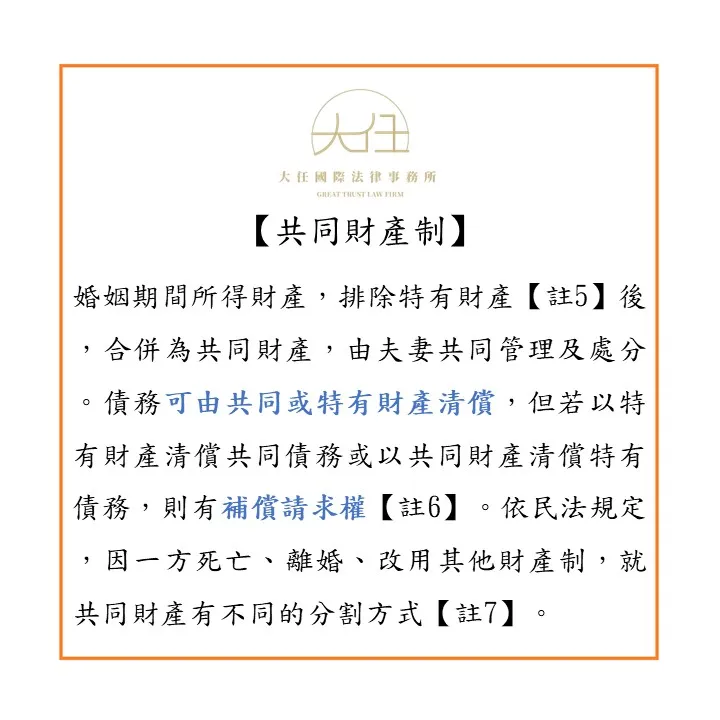 「共同財產制」為夫妻將原有財產及婚姻關係存續中所得之財產,排除特有財產【註5】後,合併為共同財產,除有特別約定外,由夫妻共同管理及處分;結婚前及婚姻關係存續期間所負之債務,可由共同財產、或夫妻之特有財產為清償,但若以特有財產清償共同財產之債務,或以共同財產清償特有財產之債務,則有補償請求權之適用【註6】。又採用共同財產制之夫妻,依民法第1039條及第1040條之規定,因一方死亡、離婚、改用其他財產制等事由,而就共同財產有不同的分割方式【註7】。