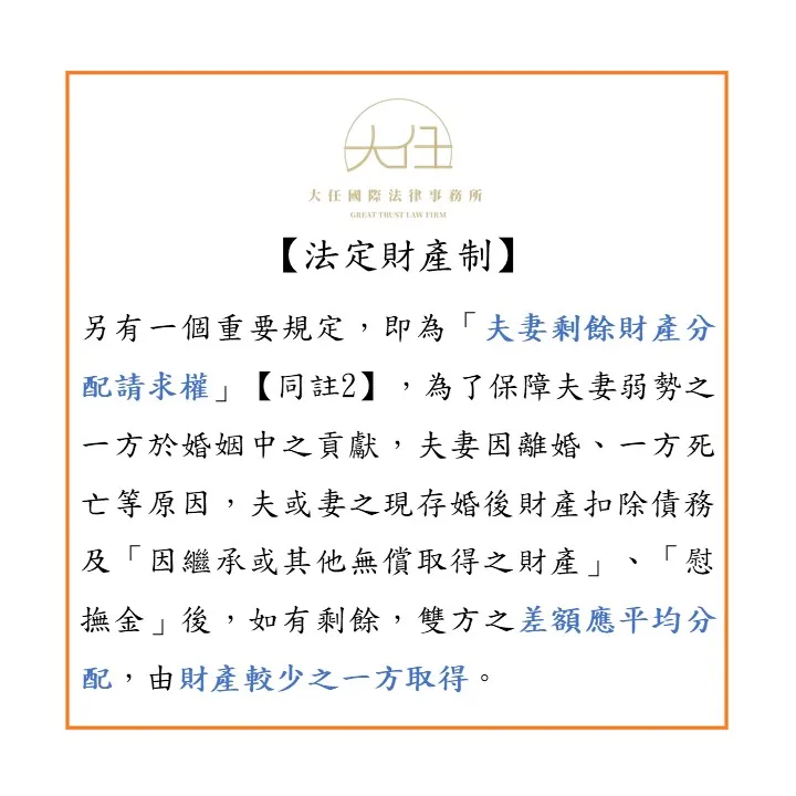 法定財產制另有一個重要規定,即為「夫妻剩餘財產分配請求權」【同註2】,為了保障夫妻弱勢之一方於婚姻中之貢獻,夫妻因離婚、一方死亡等原因,夫或妻之現存婚後財產扣除債務及「因繼承或其他無償取得之財產」、「慰撫金」後,如有剩餘,雙方之差額應平均分配,由財產較少之一方取得。