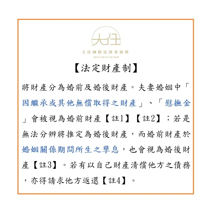「法定財產制」為夫妻未約定夫妻財產制時,當然採用之制度,將夫妻之財產分為婚前財產及婚後財產;婚前財產即為結婚前夫妻各自所有之財產,不分財產種類,此外,夫妻婚姻中「因繼承或其他無償取得之財產」、「慰撫金」會被視為婚前財產,而非婚後財產【註1】【註2】;至於婚後財產,顧名思義就是夫妻婚姻存續期間所得之財產,另外,若是無法分辨是婚前財產或婚後財產,將推定為婚後財產,而婚前財產於婚姻關係期間所生之孳息,也會視為婚後財產【註3】。不論婚前或婚後財產,均由夫妻各自使用、收益、處分,夫妻各自所負之債務由其所有之財產各負清償責任,若有以自己財產清償他方之債務,亦得請求他方返還【註4】。