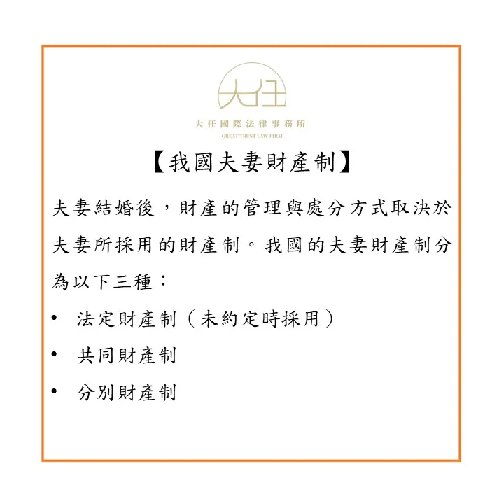 夫妻結婚後,夫或妻各自之財產該如何管理及處分,取決於採用之夫妻財產制為何。我國關於夫妻財產制,分為「法定財產制」、「共同財產制」、「分別財產制」三種。
