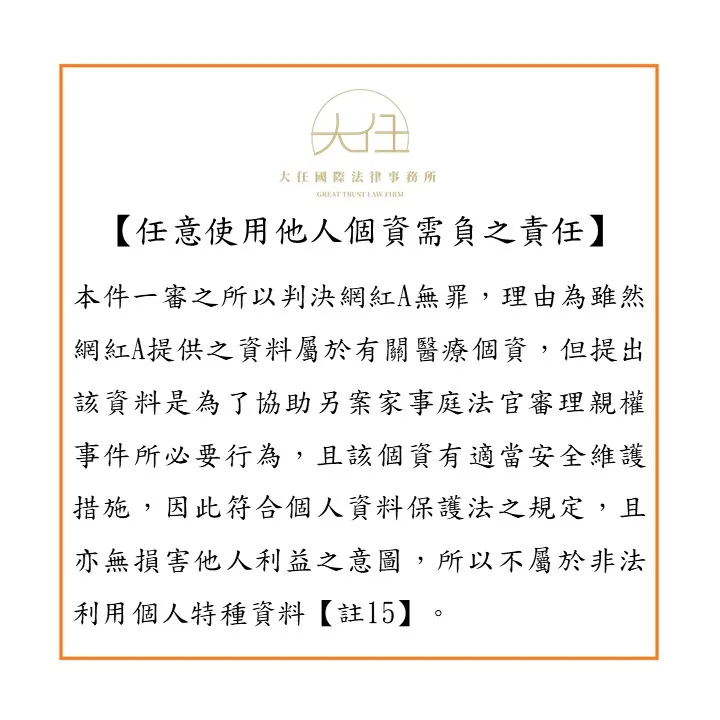 本件一審之所以判決網紅A無罪,理由為雖然網紅A提供之資料屬於個人資料保護法第6條規定之有關醫療之個人資料,原則上不得蒐集、處理或利用,但網紅A提出該有關醫療之個人資料,是為了協助另案家事庭法官審理親權事件所必要行為,且該個人資料有適當安全維護措施,因此符合人資料保護法第6條第1項但書第5款之規定,且亦無損害他人利益之意圖,所以不屬於非法利用個人特種資料【註15】。