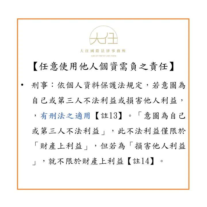 刑事部分,依個人資料保護法第41條、第42條規定,若意圖為自己或第三人不法利益或損害他人利益,而違反蒐集、處理、利用之規定或以非法變更、刪除等方式,妨害個人資料之正確,則有刑法之適用【註13】,另依實務見解,「意圖為自己或第三人不法利益」,此不法利益僅限於「財產上利益」,但若為「損害他人利益」,就不限於財產上利益【註14】。