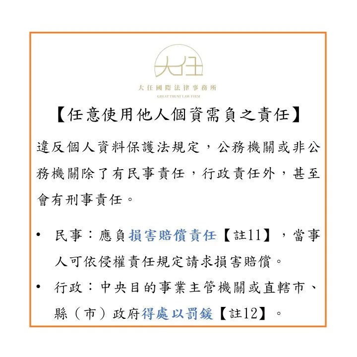 民事部分,公務機關、非公務機關因違法個人資料保護法規定,致個人資料遭到不法蒐集、處理或利用,應負損害賠償責任【註11】,而當事人除依個人資料保護法規定請求損害賠償外,也可以依民法第184條侵權責任規定請求損害賠償。
