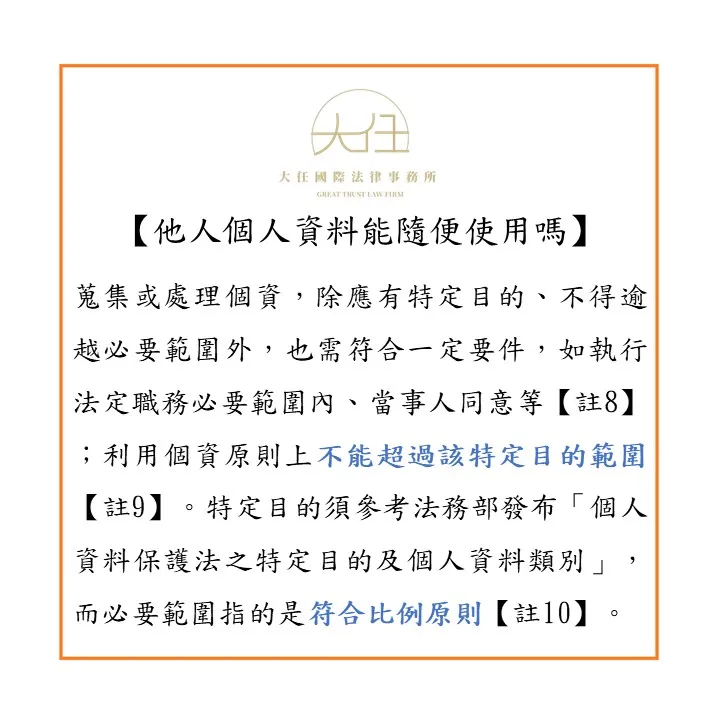 而公務機關或非公務機關蒐集或處理個人資料,除應有特定目的、不得逾越必要範圍外,也需符合一定要件,如執行法定職務必要範圍內、當事人同意等【註8】;利用個人資料原則上不能超過該特定目的範圍【註9】;特定目的為何,須參考法務部發布之「個人資料保護法之特定目的及個人資料類別」說明符合哪種特定目的,而必要範圍,簡單說就是蒐集、處理或利用要符合比例原則之規定【註10】。