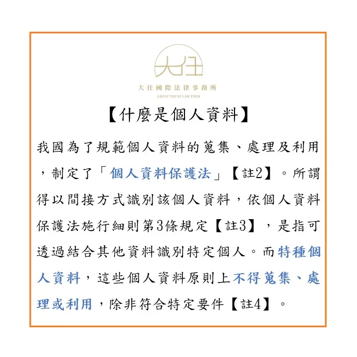 我國為了規範個人資料的蒐集、處理及利用,制定了「個人資料保護法」,個人資料,指的是「自然人之姓名、出生年月日、國民身分證統一編號、護照號碼、特徵、指紋、婚姻、家庭、教育、職業、病歷、醫療、基因、性生活、健康檢查、犯罪前科、聯絡方式、財務情況、社會活動及其他得以直接或間接方式識別該個人之資料」【註2】。所謂得以間接方式識別該個人之資料,依個人資料保護法施行細則第3條規定【註3】,是指該資料可以透過結合其他資料來識別該特定之個人。