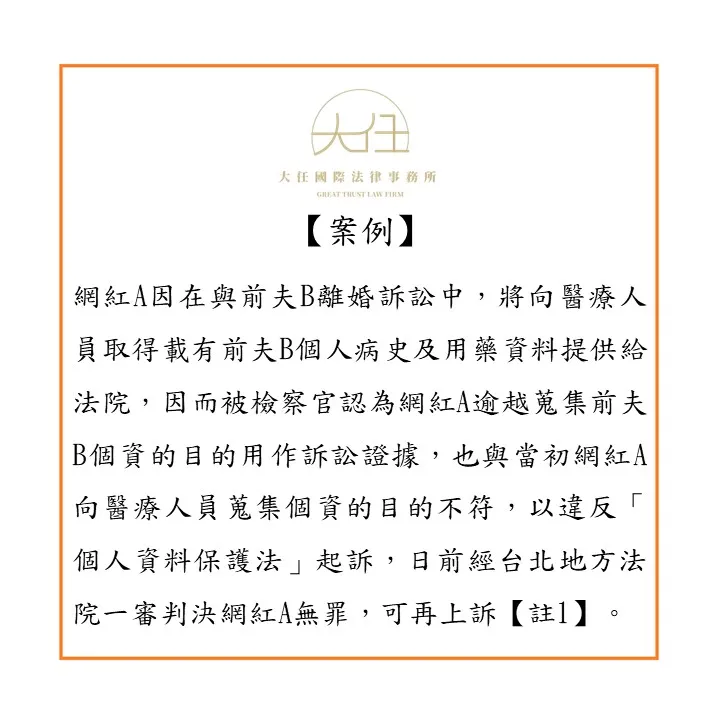 網紅A因在與前夫B離婚訴訟中,將向醫療人員取得載有前夫B個人病史及用藥資料提供給法院,因而被檢察官認為網紅A逾越蒐集前夫B個資的目的用作訴訟證據,也與當初網紅A向醫療人員蒐集個資的目的不符,以違反「個人資料保護法」起訴,日前經台北地方法院一審判決網紅A無罪,可再上訴【註1】。