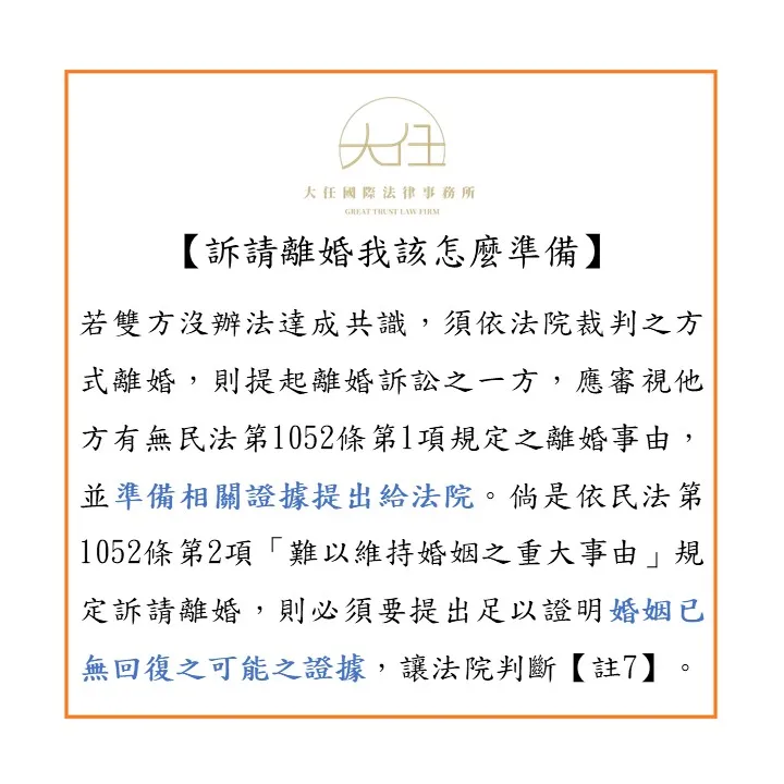 倘是依民法第1052條第2項「難以維持婚姻之重大事由」規定訴請離婚,則必須要提出足以證明雙方欠缺共同生活、相互扶持、同甘共苦以共創家庭生活之實質內涵,復喪失應有之互愛、互信、互諒、互持等重要基石,婚姻已無回復之可能之證據,如夫妻之一方外遇、分居數年,或無性生活等事實,讓法院判斷【註7】。