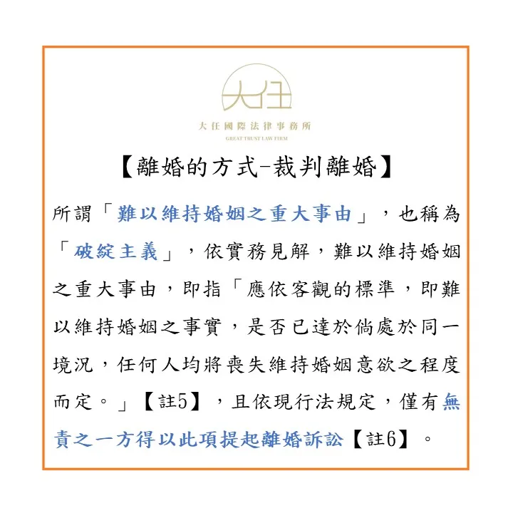 所謂「難以維持婚姻之重大事由」,也稱為「破綻主義」,依實務見解,難以維持婚姻之重大事由,即指「應依客觀的標準,即難以維持婚姻之事實,是否已達於倘處於同一境況,任何人均將喪失維持婚姻意欲之程度而定。」【註5】,且依現行法規定,僅有無責之一方得以此項提起離婚訴訟【註6】。