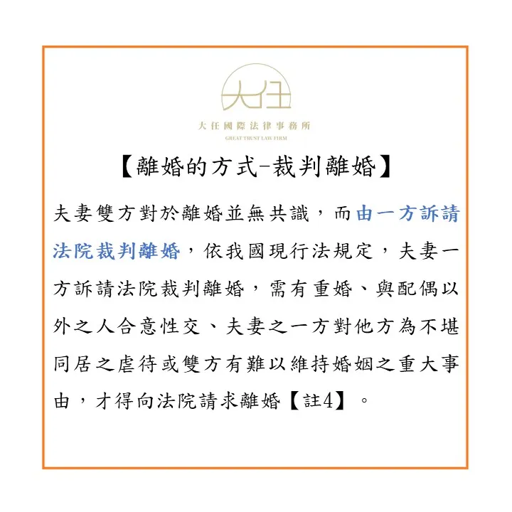 關於夫妻間如何離婚,可以分為「協議離婚」及「裁判離婚」兩種方式,協議離婚是指夫妻雙方對於離婚均有共識,自行協調離婚及離婚後之事宜,如離婚後財產如何分配、未成年子女之權利義務由誰行使負擔、扶養費該如何給付等,此種離婚方式需以書面為之,加上兩名以上證人簽名,向戶政機關為離婚登記【註3】;裁判離婚是指夫妻雙方對於離婚並無共識,而由一方訴請法院裁判離婚,依我國現行法規定,夫妻一方訴請法院裁判離婚,需有重婚、與配偶以外之人合意性交、夫妻之一方對他方為不堪同居之虐待或雙方有難以維持婚姻之重大事由,才得向法院請求離婚【註4】。