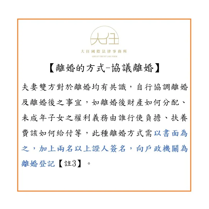【註3】民法第1049條:「夫妻兩願離婚者,得自行離婚。」、第1050條:「兩願離婚,應以書面為之,有二人以上證人之簽名並應向戶政機關為離婚之登記。」