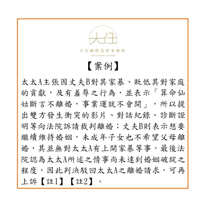 太太A主張因丈夫B對其家暴、貶低其對家庭的貢獻,及有羞辱之行為,並表示「算命仙姑斷言不離婚,事業運就不會開」,所以提出雙方發生衝突的影片、對話紀錄、診斷證明等向法院訴請裁判離婚;丈夫B則表示想要繼續維持婚姻,未成年子女也不希望父母離婚,其並無對太太A有上開家暴等事,最後法院認為太太A所述之情事尚未達到婚姻破綻之程度,因此判決駁回太太A之離婚請求,可再上訴【註1】【註2】。