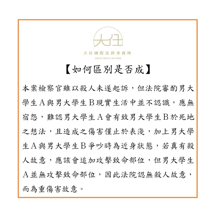 本案檢察官雖以殺人未遂起訴,但法院審酌男大學生A與男大學生B現實生活中並不認識,應無宿怨,難認男大學生A會有致男大學生B於死地之想法,且造成之傷害僅止於表淺,加上男大學生A與男大學生B爭吵時為近身狀態,若真有殺人故意,應該會追加攻擊致命部位,但男大學生A並無攻擊致命部位,因此法院認無殺人故意,而為重傷害故意。