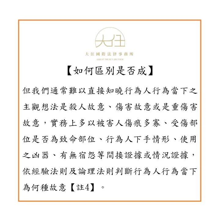 但我們通常難以直接知曉行為人行為當下之主觀想法是殺人故意、傷害故意或是重傷害故意,實務上多以被害人傷痕多寡、受傷部位是否為致命部位、行為人下手情形、使用之凶器、有無宿怨等間接證據或情況證據,依經驗法則及論理法則判斷行為人行為當下為何種故意【註4】。