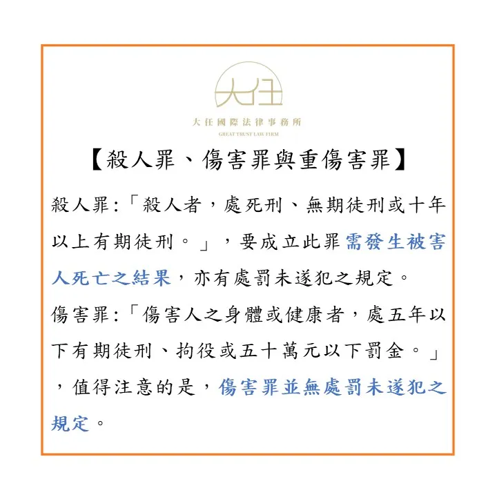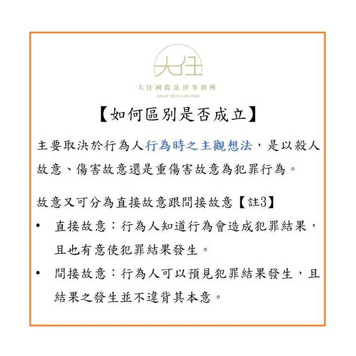 要區別是否成立殺人罪、傷害罪或重傷害罪,主要取決於行為人行為時之主觀想法,即行為人是以殺人故意、傷害故意還是重傷害故意為犯罪行為。