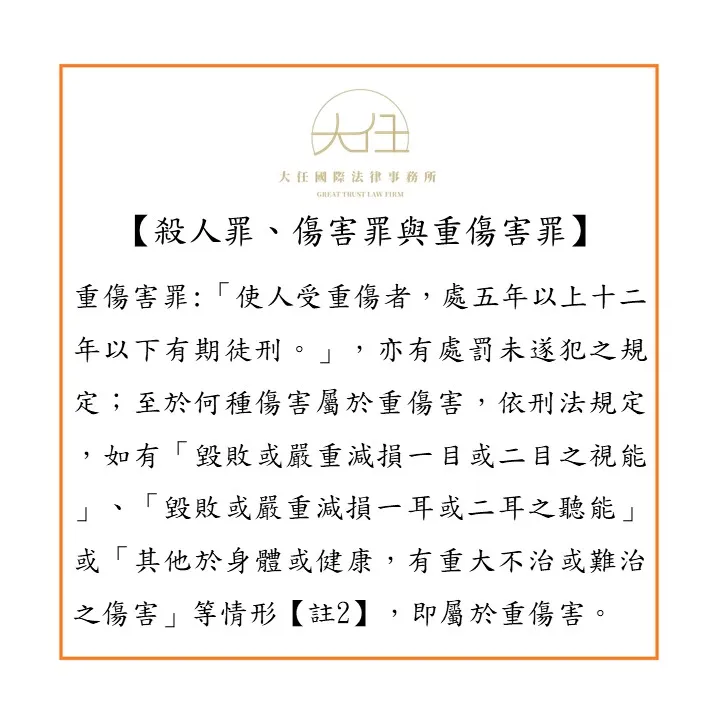 重傷害罪,規定在我國刑法第278條第1項:「使人受重傷者,處五年以上十二年以下有期徒刑。」,亦有處罰未遂犯之規定;至於何種傷害屬於重傷害,依刑法第10條第4項之規定,如有「毀敗或嚴重減損一目或二目之視能」、「毀敗或嚴重減損一耳或二耳之聽能」或「其他於身體或健康,有重大不治或難治之傷害」等情形【註2】,即屬於重傷害。