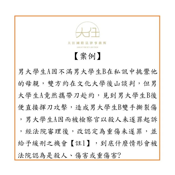 男大學生A因不滿男大學生B在私訊中挑釁他的母親,雙方約在文化大學後山談判,但男大學生A竟然攜帶刀赴約,見到男大學生B後便直接揮刀攻擊,造成男大學生B雙手撕裂傷,男大學生A因而被檢察官以殺人未遂罪起訴,經法院審理後,改認定為重傷未遂罪,並給予緩刑之機會【註1】,到底什麼情形會被法院認為是殺人、傷害或重傷害?