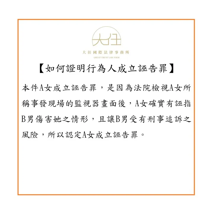 本件A女成立誣告罪,是因為法院檢視A女所稱事發現場的監視器畫面後,A女確實有誣指B男傷害她之情形,且讓B男受有刑事追訴之風險,所以認定A女成立誣告罪。