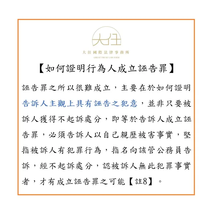 誣告罪之所以很難成立,主要在於如何證明告訴人主觀上具有誣告之犯意,並非只要被訴人獲得不起訴處分,即等於告訴人成立誣告罪,必須告訴人以自己親歷被害事實,堅指被訴人有犯罪行為,指名向該管公務員告訴,經不起訴處分,認被訴人無此犯罪事實者,才有成立誣告罪之可能(也就是說無中生有的事實,才有可能成立誣告罪)【註8】。
