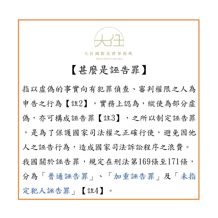我國關於誣告罪,規定在刑法第169條至171條,分為「普通誣告罪」、「加重誣告罪」及「未指定犯人誣告罪」【註4】。