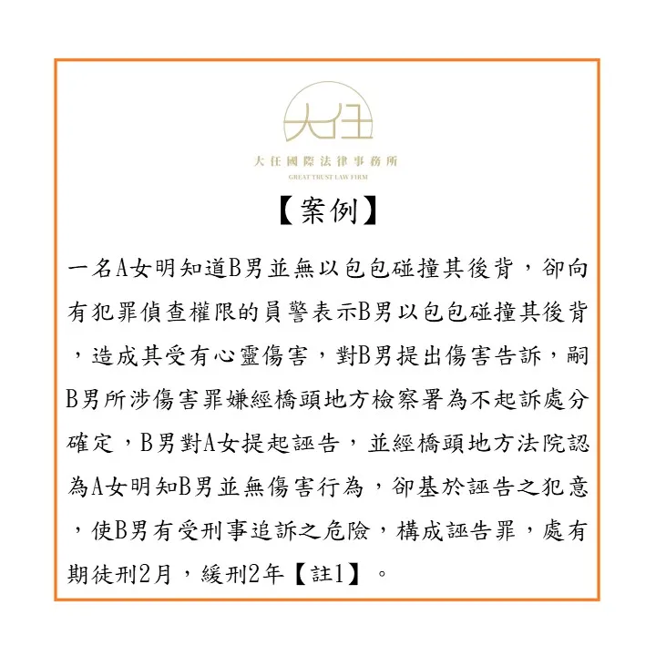 一名A女明知道B男並無以包包碰撞其後背,卻向有犯罪偵查權限的員警表示B男以包包碰撞其後背,造成其受有心靈傷害,對B男提出傷害告訴,嗣B男所涉傷害罪嫌經橋頭地方檢察署為不起訴處分確定,B男對A女提起誣告,並經橋頭地方法院認為A女明知B男並無傷害行為,卻基於誣告之犯意,使B男有受刑事追訴之危險,構成誣告罪,處有期徒刑2月,緩刑2年【註1】。