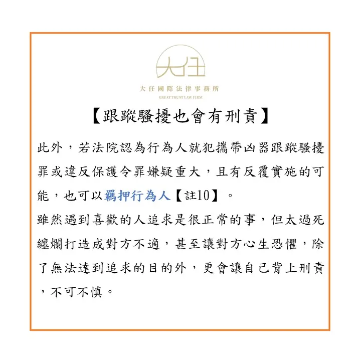 【註10】跟蹤騷擾防制法第21條:「行為人經法官訊問後,認其犯第十八條第二項、第十九條之罪嫌疑重大,有事實足認為有反覆實行之虞,而有羈押之必要者,得羈押之。」