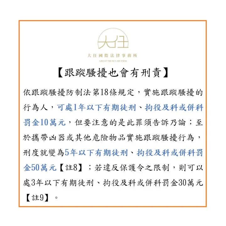 依跟蹤騷擾防制法第18條規定,實施跟蹤騷擾的行為人,可處1年以下有期徒刑、拘役及科或併科罰金10萬元(跟蹤騷擾罪),但要注意的是此罪須告訴乃論;至於攜帶凶器或其他危險物品實施跟蹤騷擾行為,刑度就變為5年以下有期徒刑、拘役及科或併科罰金50萬元(攜帶凶器跟蹤騷擾罪)【註8】;若違反保護令之限制,則可以處3年以下有期徒刑、拘役及科或併科罰金30萬元(違反保護令罪)【註9】。