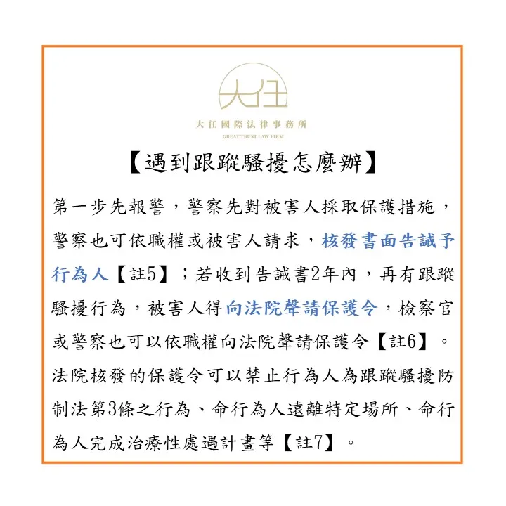 遇到跟蹤騷擾的情形,第一步就是先報警,由警察先對被害人採取保護措施,警察也可依職權或被害人之請求,核發書面告誡予行為人,告誡行為人不得再為跟蹤騷擾行為【註5】;若行為人收到告誡書2年內,再有跟蹤騷擾行為的話,被害人得向法院聲請保護令,檢察官或警察也可以依職權向法院聲請保護令【註6】。