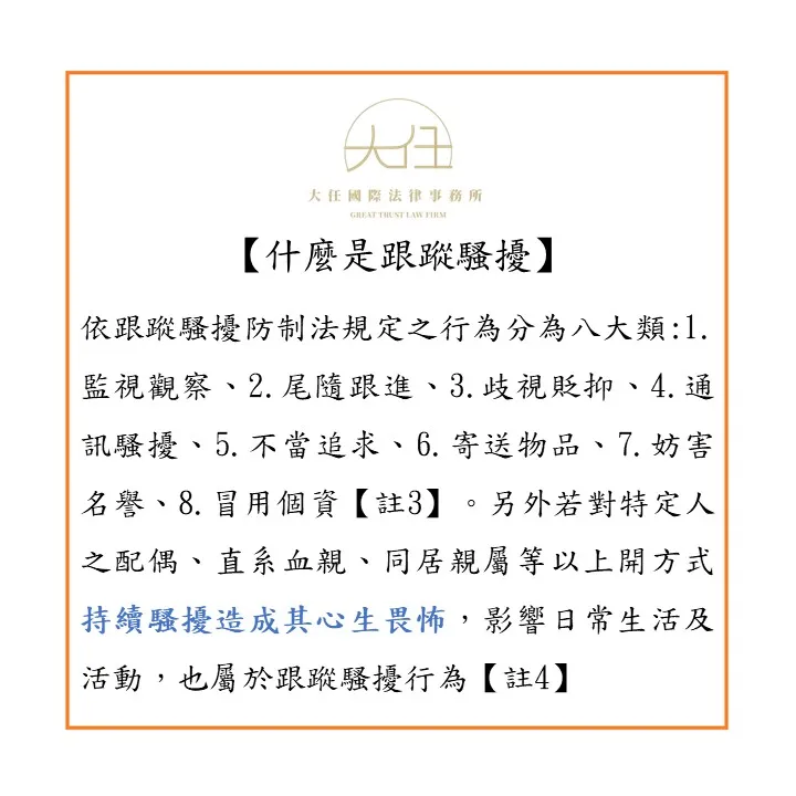 所謂跟蹤騷擾行為,依跟蹤騷擾防制法第3條第1項規定,是指行為人以人員、車輛、工具、設備、電子通訊、網際網路或其他方式,對特定人反覆或持續以違反其意願且與性或性別有關之行為【註2】,並使其心生畏怖,影響日常生活或活動;依該條規定之行為分為八大類:1.監視觀察、2.尾隨跟進、3.歧視貶抑、4.通訊騷擾、5.不當追求、6.寄送物品、7.妨害名譽、8.冒用個資【註3】。另外若對特定人之配偶、直系血親、同居親屬等以上開方式持續騷擾造成其心生畏怖,影響日常生活及活動,也屬於跟蹤騷擾行為【註4】