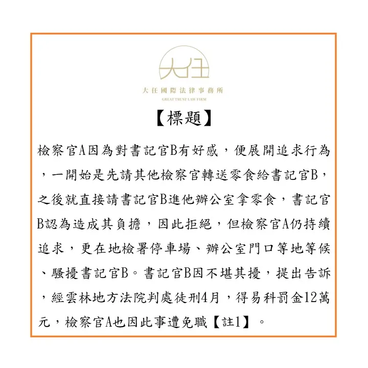 檢察官A因為對書記官B有好感,便展開追求行為,一開始是先請其他檢察官轉送零食給書記官B,之後就直接請書記官B進他辦公室拿零食,書記官B認為造成其負擔,因此拒絕,但檢察官A仍持續追求,更在地檢署停車場、辦公室門口等地等候、騷擾書記官B。書記官B因不堪其擾,提出告訴,經雲林地方法院判處徒刑4月,得易科罰金12萬元,檢察官A也因此事遭免職【註1】。