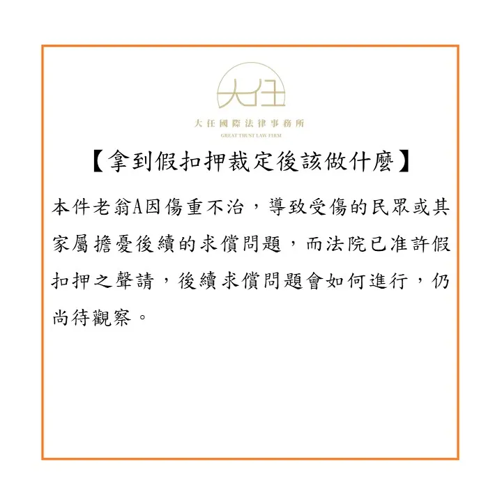 本件老翁A因傷重不治,導致受傷的民眾或其家屬擔憂後續的求償問題,而法院已准許假扣押之聲請,後續求償問題會如何進行,仍尚待觀察。