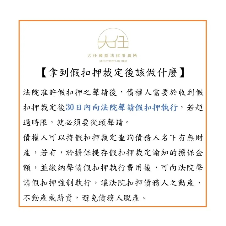 法院准許假扣押之聲請後,並非等於債務人的財產已經被假扣押,債權人需要於收到假扣押裁定後30日內向法院聲請假扣押執行,若超過時限,就必須要從頭聲請。