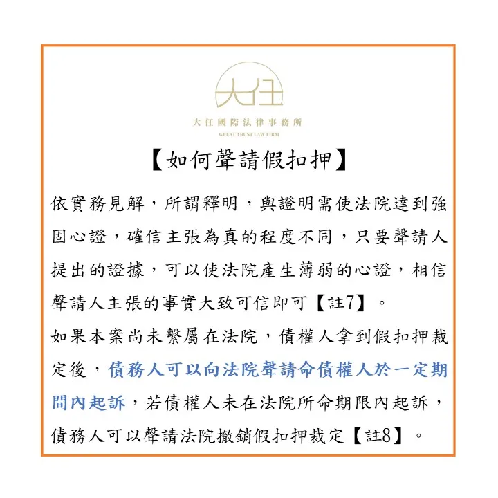 要注意的是,如果本案尚未繫屬在法院(如已經起訴請求債務人返還金錢),債權人拿到假扣押裁定後,債務人可以向法院聲請命債權人於一定期間內起訴,若債權人未在法院所命期限內起訴,債務人可以聲請法院撤銷假扣押裁定【註8】,因此債權人還是得盡快起訴。