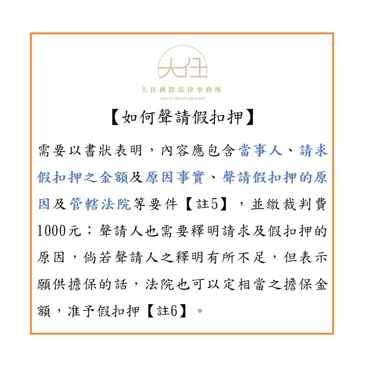聲請假扣押,需要以書狀表明,內容應包含當事人、請求假扣押之金額及原因事實、聲請假扣押的原因及管轄法院等要件【註5】,並繳裁判費1000元;聲請人也需要釋明請求及假扣押的原因,倘若聲請人之釋明有所不足,但表示願供擔保的話,法院也可以定相當之擔保金額,准予假扣押【註6】。