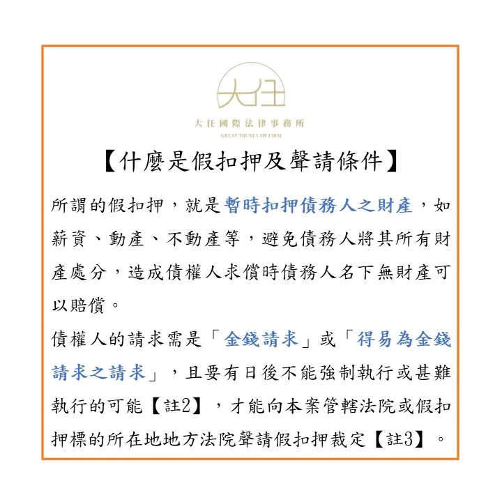 【註2】民事訴訟法第522條第1項:「債權人就金錢請求或得易為金錢請求之請求,欲保全強制執行者,得聲請假扣押。」;第523條第1項:「假扣押,非有日後不能強制執行或甚難執行之虞者,不得為之。」
