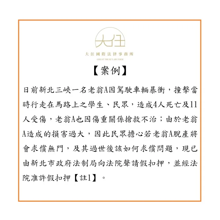 日前新北三峽一名老翁A因駕駛車輛暴衝,撞擊當時行走在馬路上之學生、民眾,造成4人死亡及11人受傷,老翁A也因傷重關係搶救不治;由於老翁A造成的損害過大,因此民眾擔心若老翁A脫產將會求償無門,及其過世後該如何求償問題,現已由新北市政府法制局向法院聲請假扣押,並經法院准許假扣押【註1】。