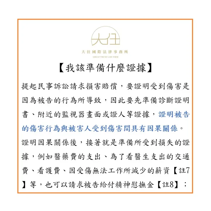 證明因果關係後,接著就是準備所受到損失的證據,例如醫藥費的支出、為了看醫生支出的交通費、看護費、因受傷無法工作所減少的薪資【註7】等,也可以請求被告給付精神慰撫金【註8】;但請求精神慰撫金,就必須要提出確實因傷害行為受有精神上的痛苦,而這通常都比較難證明,法院核定的金額也不會太高。