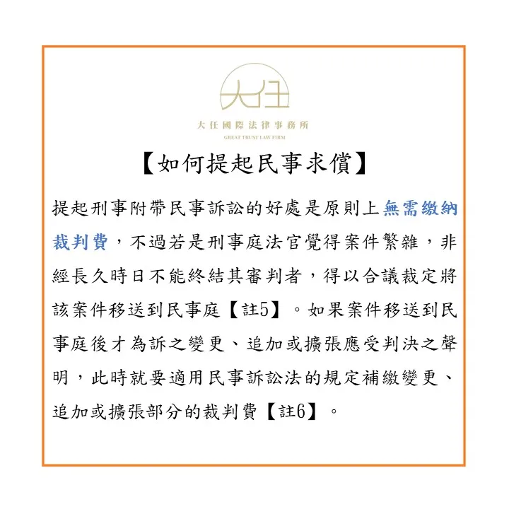 提起刑事附帶民事訴訟的好處是原則上無需繳納裁判費,不過若是刑事庭法官覺得案件繁雜,非經長久時日不能終結其審判者,得以合議裁定將該案件移送到民事庭【註5】。如果案件移送到民事庭後才為訴之變更、追加或擴張應受判決之聲明,此時就要適用民事訴訟法的規定補繳變更、追加或擴張部分的裁判費【註6】。