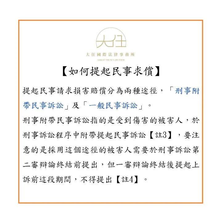 【註3】刑事訴訟法第487條第1項:「因犯罪而受損害之人,於刑事訴訟程序得附帶提起民事訴訟,對於被告及依民法負賠償責任之人,請求回復其損害。」