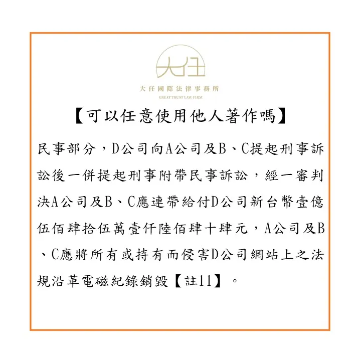 民事部分,D公司向A公司及B、C提起刑事訴訟後一併提起刑事附帶民事訴訟,經一審判決A公司及B、C應連帶給付D公司新台幣壹億伍佰肆拾伍萬壹仟陸佰肆十肆元,A公司及B、C應將所有或持有而侵害D公司網站上之法規沿革電磁紀錄銷毀【註11】。