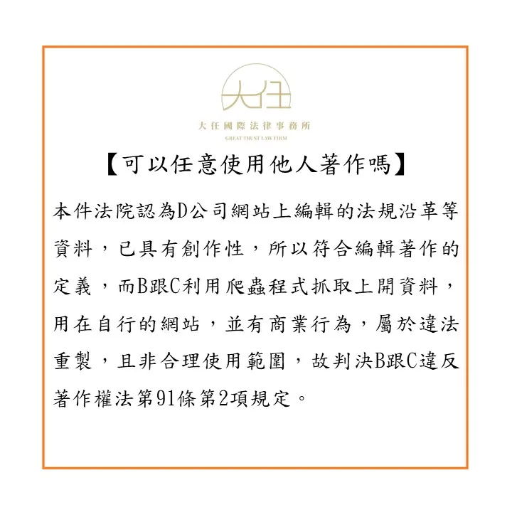 本件法院認為D公司網站上編輯的法規沿革等資料,已具有創作性,所以符合編輯著作的定義,而B跟C利用爬蟲程式抓取上開資料,用在自行的網站,並有商業行為,屬於違法重製,且非合理使用範圍,故判決B跟C違反著作權法第91條第2項規定。