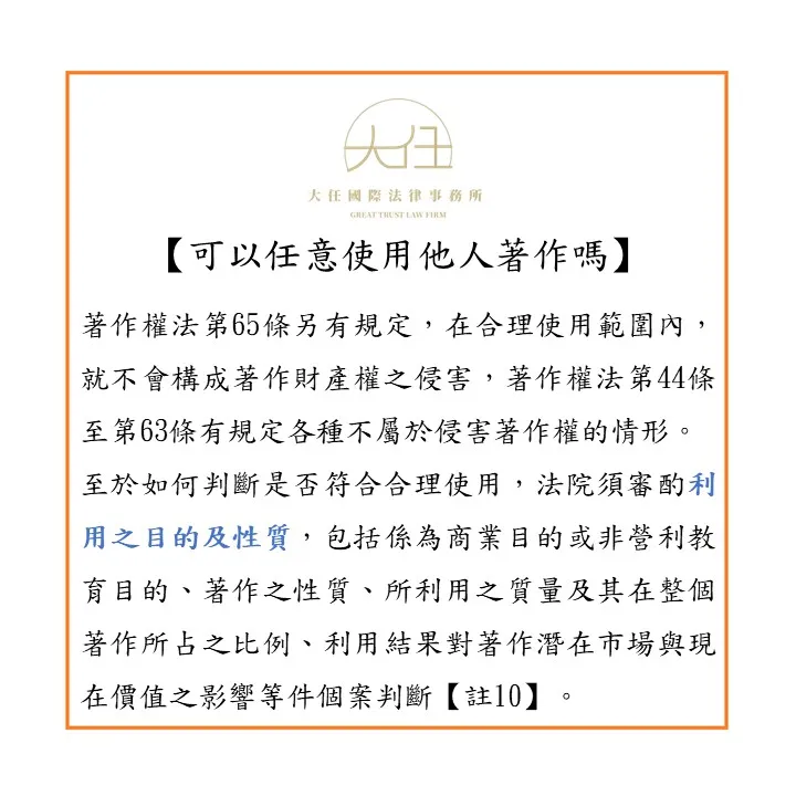 至於如何判斷是否符合合理使用,法院須審酌利用之目的及性質,包括係為商業目的或非營利教育目的、著作之性質、所利用之質量及其在整個著作所占之比例、利用結果對著作潛在市場與現在價值之影響等件個案判斷【註10】。
