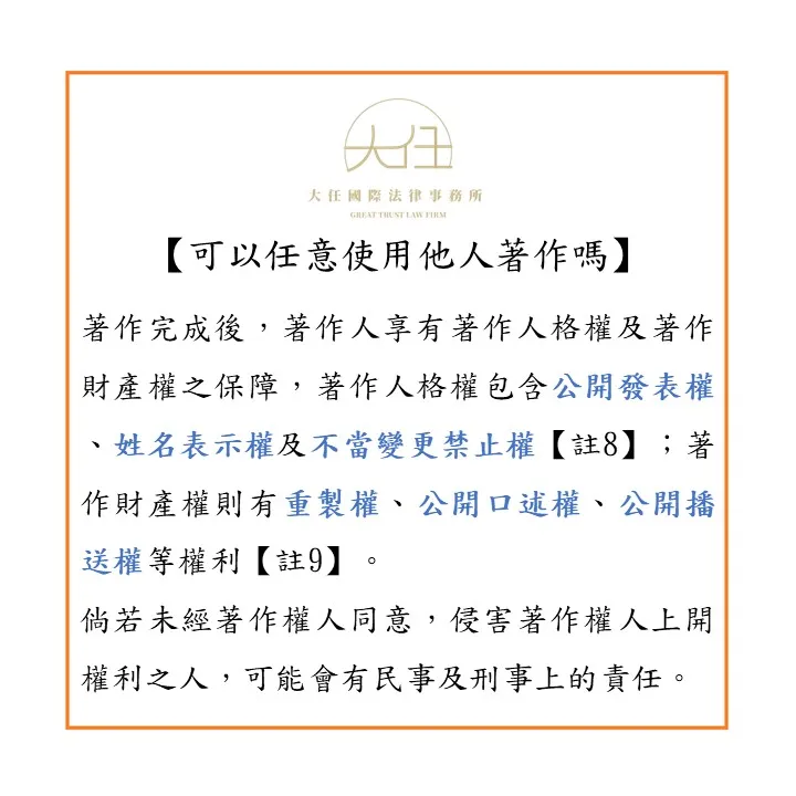 著作完成後,著作人享有著作人格權及著作財產權之保障,著作人格權包含公開發表權、姓名表示權及不當變更禁止權【註8】;著作財產權則有重製權、公開口述權、公開播送權等權利【註9】。