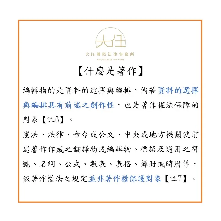 【註6】著作權法第7條第1項:「就資料之選擇及編排具有創作性者為編輯著作,以獨立之著作保護之。」