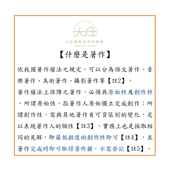 要成為著作權法上保障之著作,必須具有原始性及創作性,所謂原始性,是指著作人原始獨立完成創作,並非抄襲他人作品而來;所謂創作性,不須達到前無古人之程度,只需要與其他著作有可資區別的變化,足以表現著作人的個性即可【註3】,實務上也是採取相同的見解,即最低程度的創作性即可【註4】,且著作完成時即可取得著作權,不需登記【註5】。