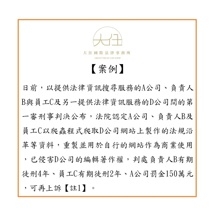 日前,以提供法律資訊搜尋服務的A公司、負責人B與員工C及另一提供法律資訊服務的D公司間的第一審刑事判決公布,法院認定A公司、負責人B及員工C以爬蟲程式爬取D公司網站上製作的法規沿革等資料,重製並用於自行的網站作為商業使用,已侵害D公司的編輯著作權,判處負責人B有期徒刑4年、員工C有期徒刑2年、A公司罰金150萬元,可再上訴【註1】。