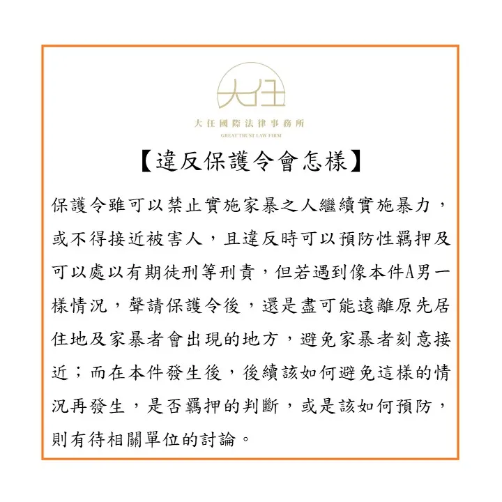 保護令雖可以禁止實施家暴之人繼續實施暴力,或不得接近被害人,且違反時可以預防性羈押及可以處以有期徒刑等刑責,但若遇到像本件A男一樣情況,聲請保護令後,還是盡可能遠離原先居住地及家暴者會出現的地方,避免家暴者刻意接近;而在本件發生後,後續該如何避免這樣的情況再發生,是否羈押的判斷,或是該如何預防,則有待相關單位的討論。