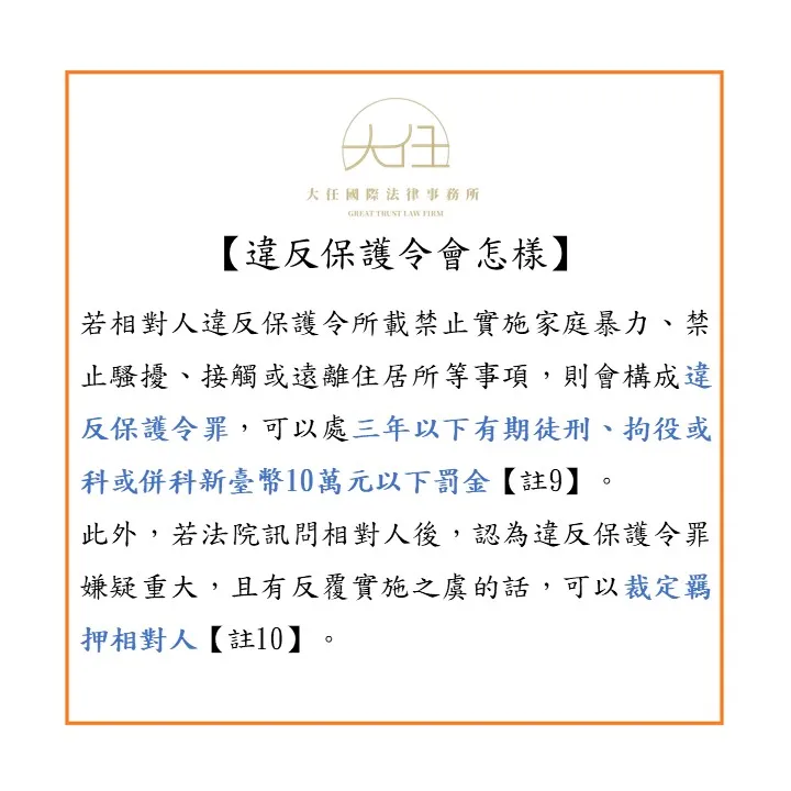 若相對人違反保護令所載禁止實施家庭暴力、禁止騷擾、接觸或遠離住居所等事項,則會構成違反保護令罪,可以處三年以下有期徒刑、拘役或科或併科新臺幣10萬元以下罰金【註9】。