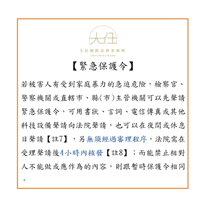【註7】家庭暴力防治法第12條第1項:「保護令之聲請,應以書面為之。但被害人有受家庭暴力之急迫危險者,檢察官、警察機關或直轄市、縣(市)主管機關,得以言詞、電信傳真或其他科技設備傳送之方式聲請緊急保護令,並得於夜間或休息日為之。」