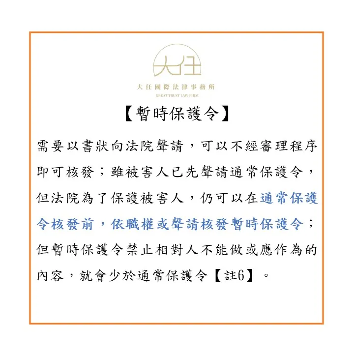 【註6】家庭暴力防治法第16條第1至3項:「法院核發暫時保護令或緊急保護令,得不經審理程序。」、「法院為保護被害人,得於通常保護令審理終結前,依聲請或依職權核發暫時保護令。」、「法院得依聲請或依職權,核發第十四條第一項第一款至第七款、第十二款至第十四款及第十六款之暫時保護令或緊急保護令;聲請人為直轄市、縣(市)主管機關者,法院並得依其聲請核發同條項第十款之暫時保護令或緊急保護令。」