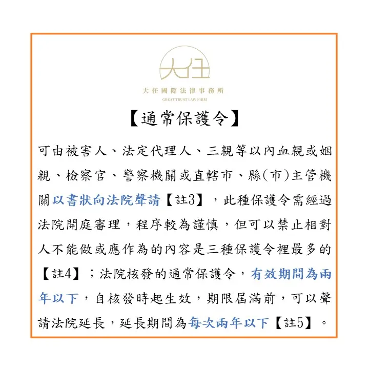 通常保護令可由被害人、法定代理人、三親等以內血親或姻親、檢察官、警察機關或直轄市、縣(市)主管機關以書狀向法院聲請【註3】,此種保護令需經過法院開庭審理,程序較為謹慎,但可以禁止相對人不能做或應作為的內容是三種保護令裡最多的【註4】;法院核發的通常保護令,有效期間為兩年以下,自核發時起生效,期限屆滿前,可以聲請法院延長,延長期間為每次兩年以下【註5】。